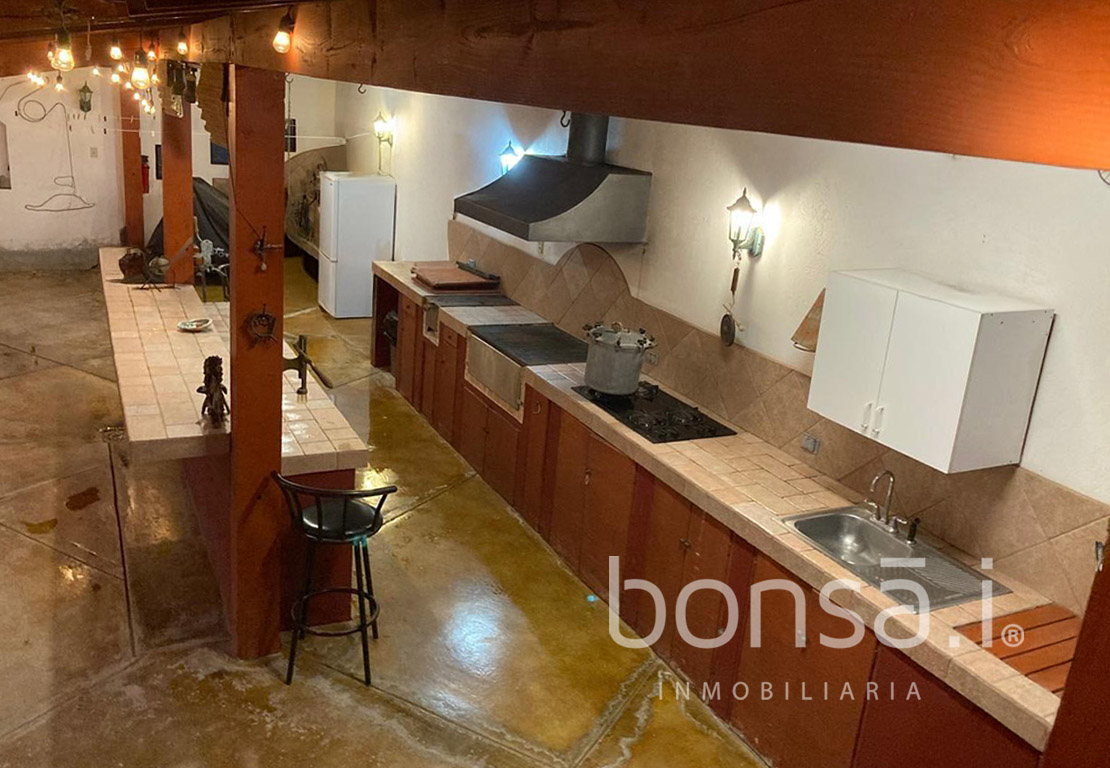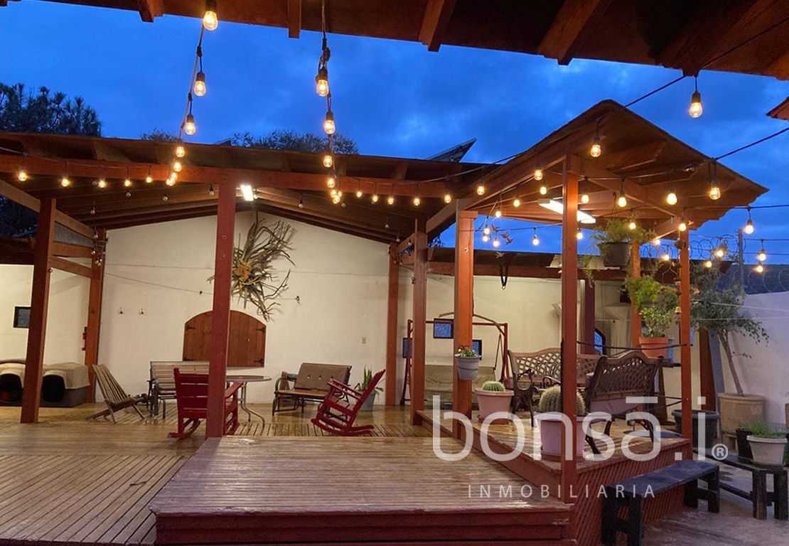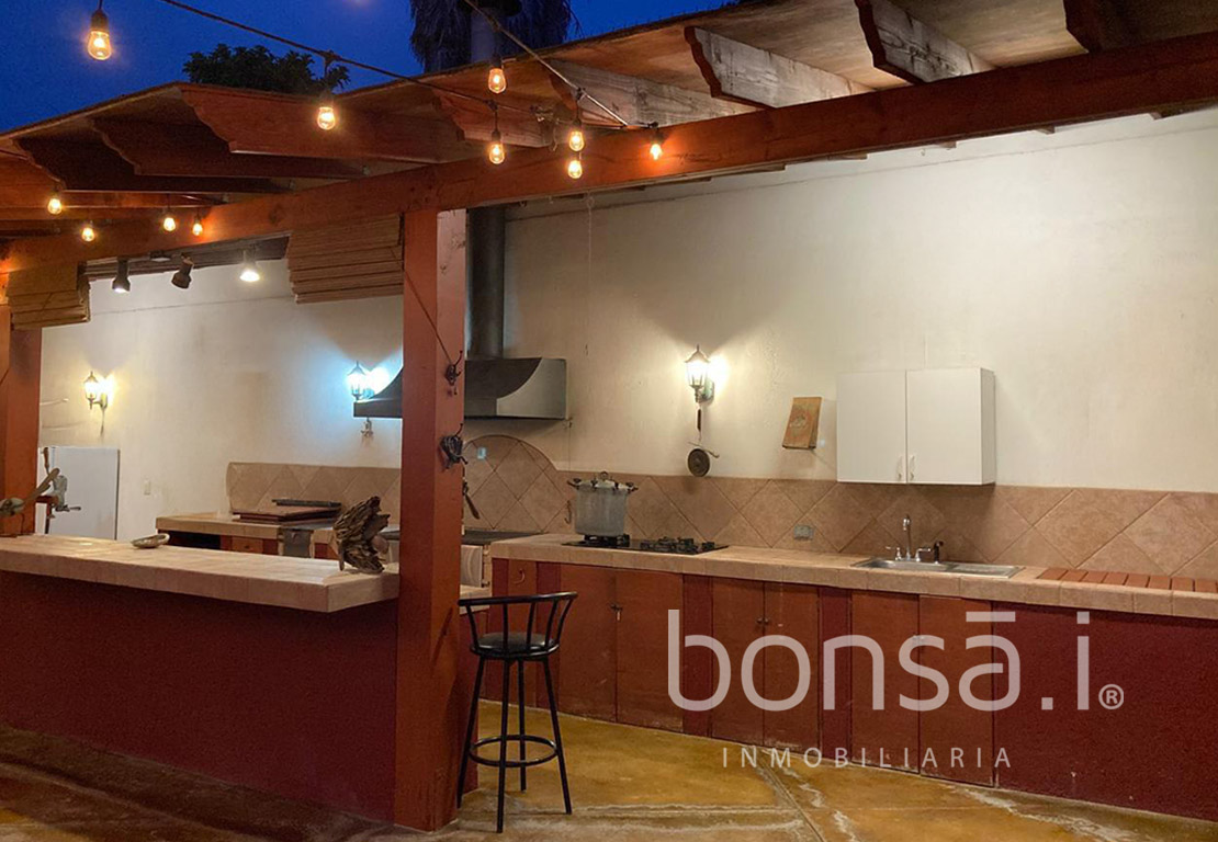 Patio posterior con terraza techada, jardineras, barra, asador, parrilla, estufa, tarja, 2 sanitarios y covachaEquipamiento